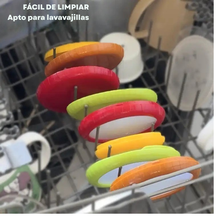 APTO PARA LAVAVAJILLAS Y FÁCIL DE LIMPIAR : El mantenimiento es facilísimo con Frilock™ . Simplemente mételos en el lavavajillas después de usarlos o lávalos a mano con agua tibia y jabón. ¡Olvídate de desperdiciar envoltorios de plástico o bolsas de plástico de un solo uso!